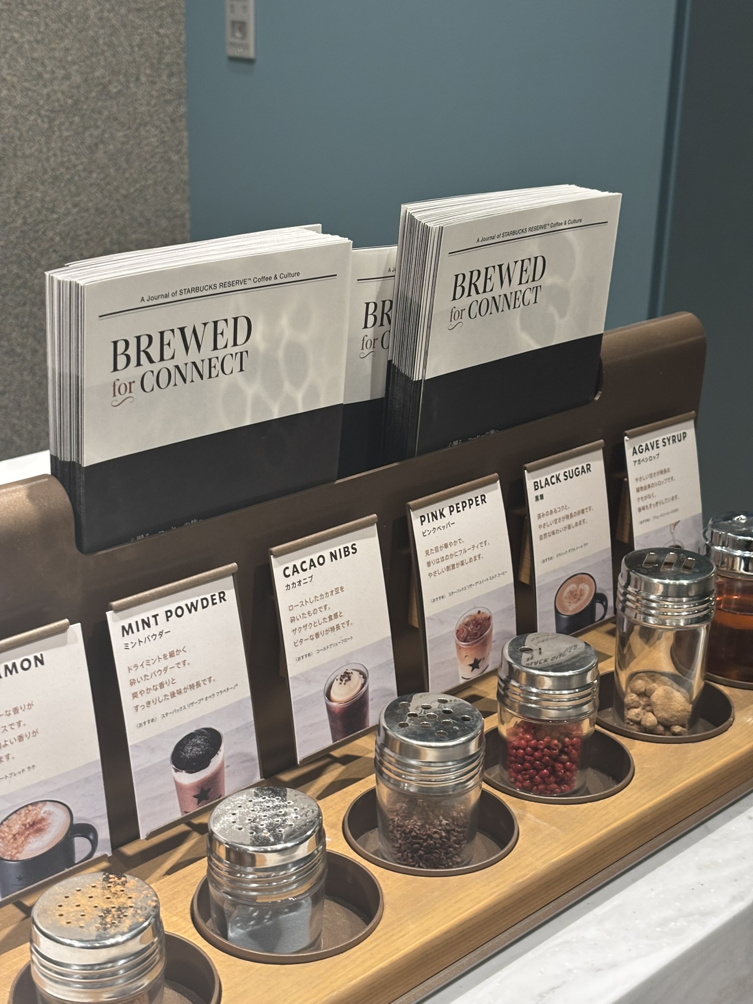 ドリンクを受け取るカウンターの横には、スパイスやトッピングが用意されたコーナーがあります。