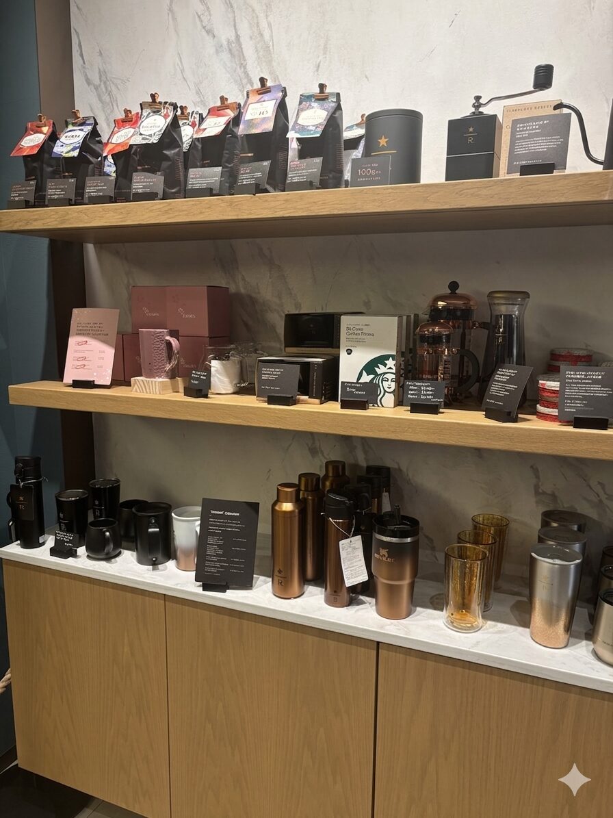 レジ横には、リザーブ店舗でしか手に入らない限定グッズや、世界中から厳選された「スターバックス リザーブ(R)」のコーヒー豆が並ぶショップコーナーが併設されています。